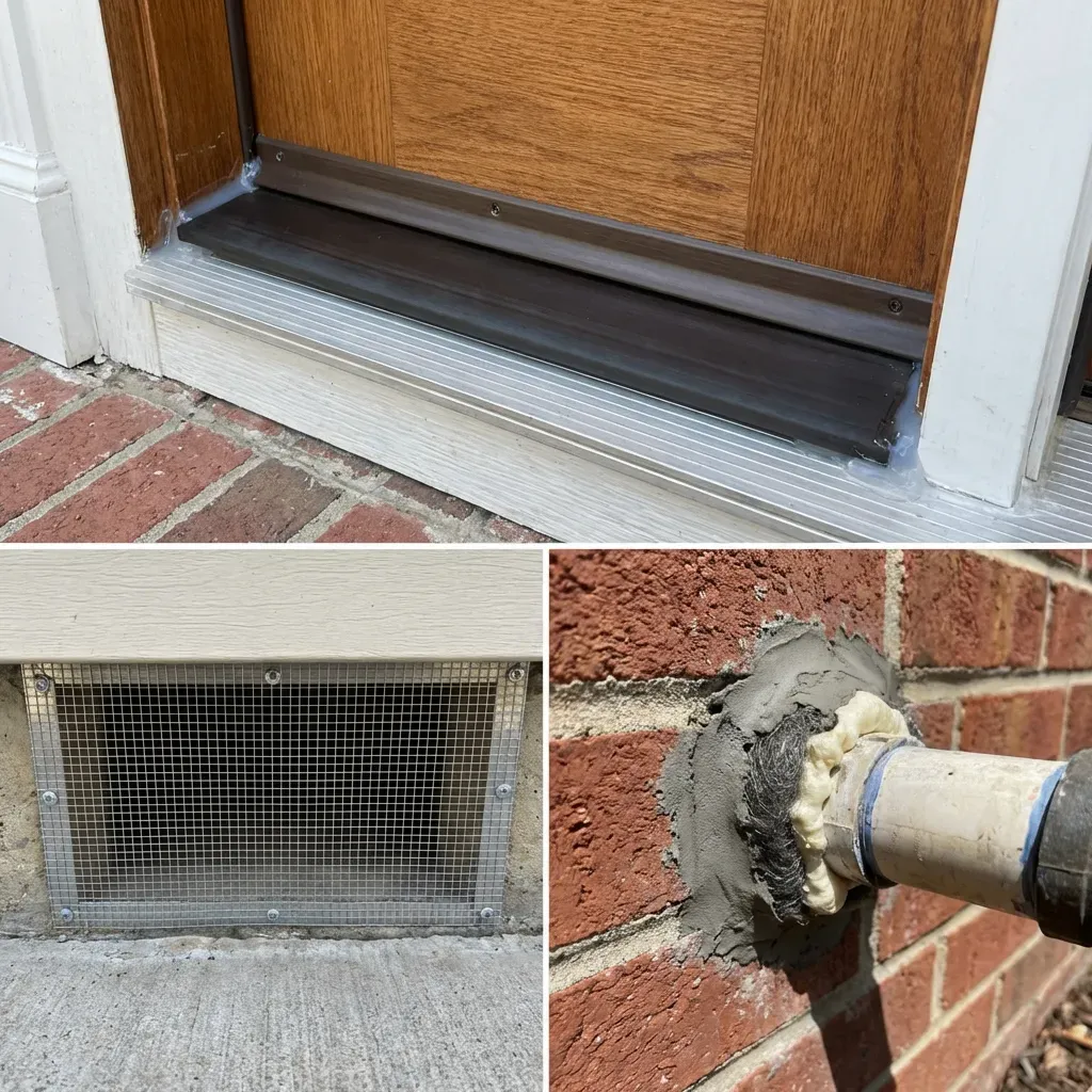 - Seal entry points around doors, pipes, vents, and rooflines.